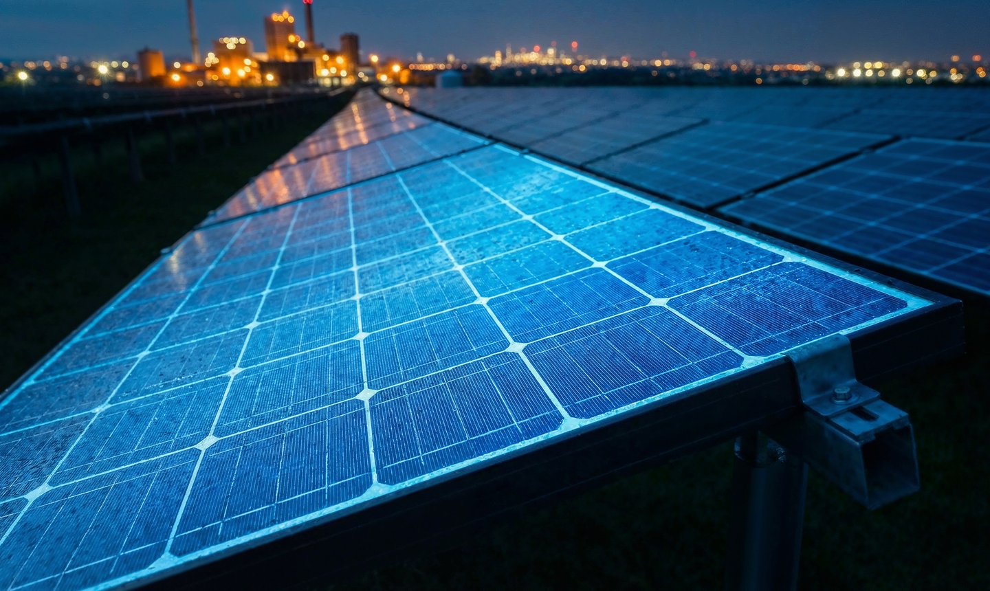 Par des champs de panneaux solaires captant l’énergie du jour.